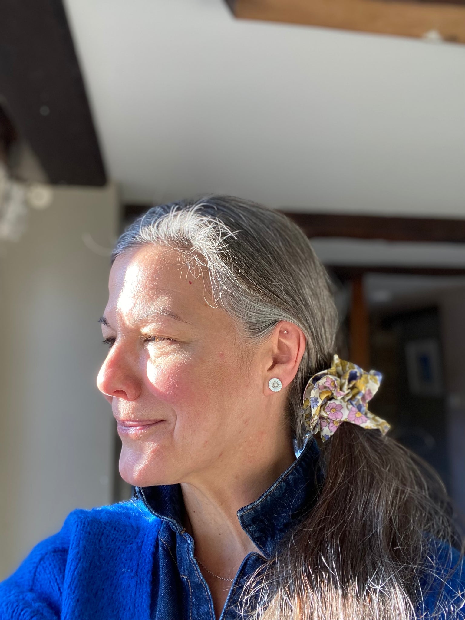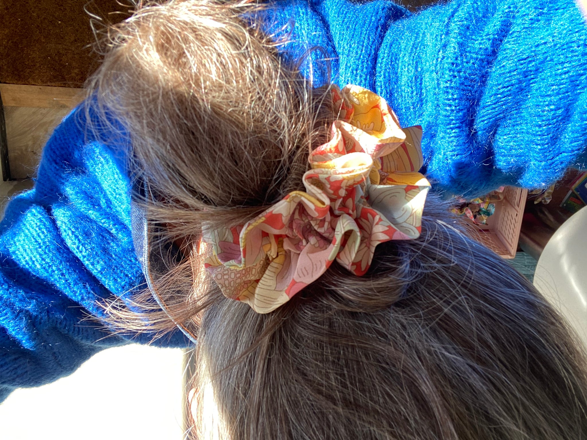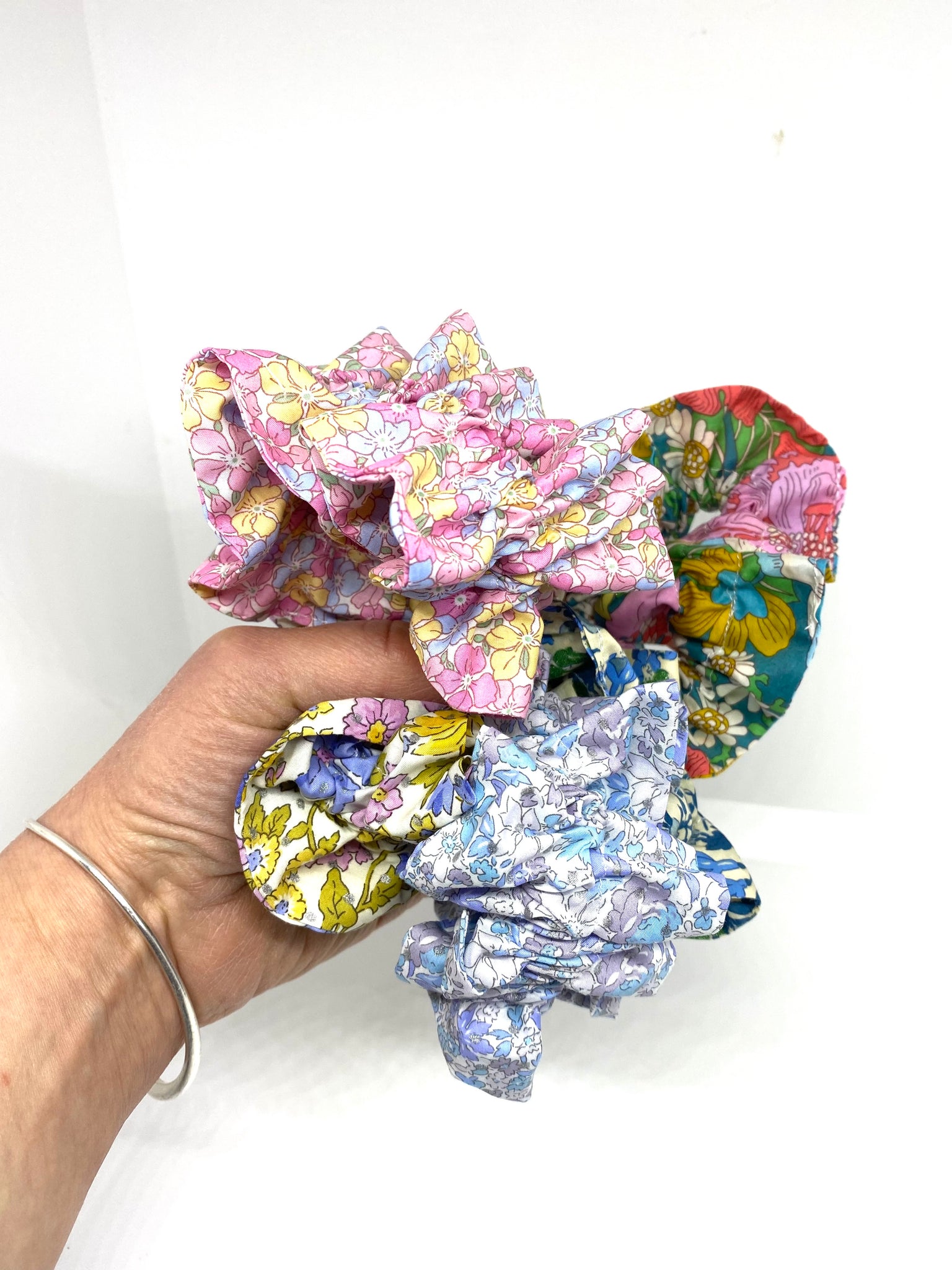 Beautiful Liberty fabric scruffle - a large scrunchy ruffle. It can be worn on your wrist, on a sleek ponytail or added to a messy bun elastic. Very unique and a firm favourite with our clients. Simply gorgeous!